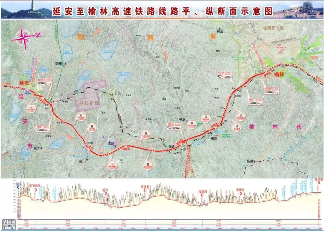 工程概況:延榆高鐵自西安至延安高速鐵路延安站北咽喉引出北行,于延安市二十里鋪機(jī)場(chǎng)設(shè)延安新區(qū)站,并設(shè)動(dòng)車存車場(chǎng);出站繼續(xù)向北,經(jīng)延安市寶塔區(qū)、延川縣,榆林市清澗縣、綏德縣、米脂縣、橫山區(qū)和榆陽區(qū)等7個(gè)區(qū)縣,終點(diǎn)(DK539+800)位于榆林市榆陽區(qū),設(shè)榆林南站,線路長度239.745km,其中延安市境內(nèi)82.556km,榆林市境內(nèi)157.189km。正線新建橋梁53.341km/67座(占線路長度的22.25%),新建隧道168.781km/51座(占線路總長度的),新設(shè)延安新區(qū)站、延川、清澗北、綏德西、米脂、榆林南6處車站。全線挖方總量3480.86萬m?,填方總量782.48萬m?;需借方總量390.19萬m?,棄渣總量3524.47萬m?;新增永久占地496.47h㎡,預(yù)計(jì)工期4.5年,工程總投資約389.17億元。