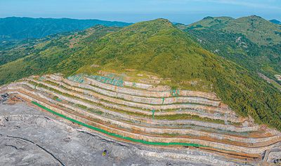 礦山生態(tài)修復(fù)工程現(xiàn)場(chǎng),覆土綠化工作正在進(jìn)行,