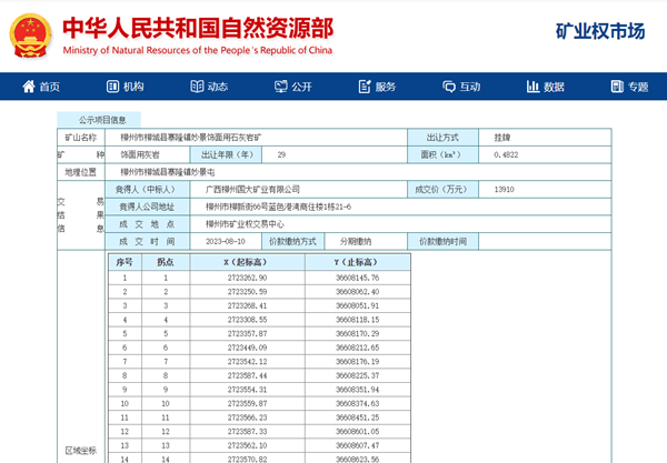 其中,溢價(jià)成交3100萬(wàn)元為柳城縣寨隆鎮(zhèn)妙景飾面用石灰?guī)r礦采礦權(quán),出讓可采資源儲(chǔ)量5710.77萬(wàn)噸(飾面用石灰?guī)r荒料396.39萬(wàn)立方米,建筑石料用灰?guī)r4640.52萬(wàn)噸),最終由廣西柳州國(guó)大礦業(yè)有限公司以13910萬(wàn)元的報(bào)價(jià)競(jìng)得該采礦權(quán),這也是柳州市今年第一宗溢價(jià)出讓的采礦權(quán)。