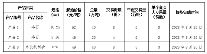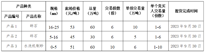 近日,中電建長崍(浠水)新材料有限公司(以下簡稱本公司)擬對(duì)本公司砂石產(chǎn)品進(jìn)行公開競價(jià)交易,產(chǎn)品單價(jià)和數(shù)量分別為碎石(16-25mm)53元/噸,共60萬噸;碎石(5-16mm)45元/噸,共30萬噸;機(jī)制砂51元/噸,共60萬噸。