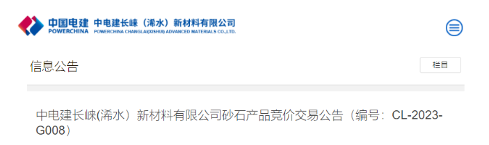 中電建長崍(浠水)新材料有限公司砂石產(chǎn)品競價(jià)交易公告(編號(hào):CL-2023-G008)中電建長崍(浠水)新材料有限公司(以下簡稱本公司)擬對(duì)本公司砂石產(chǎn)品進(jìn)行公開競價(jià)交易,現(xiàn)發(fā)布如下公告: