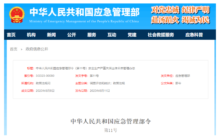 《安全生產(chǎn)嚴(yán)重失信主體名單管理辦法》已經(jīng)2023年7月17日應(yīng)急管理部第16次部務(wù)會(huì)議審議通過,現(xiàn)予公布,自2023年10月1日起施行。