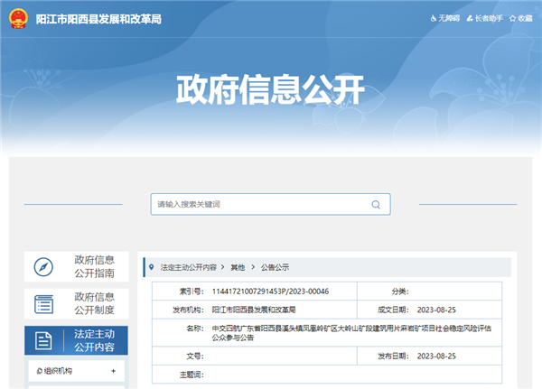 近日,中交集團旗下公司競得的廣東省陽西縣溪頭鎮(zhèn)鳳凰嶺礦區(qū)大嶺山礦段建筑用片麻巖礦項目目前正在編制社會穩(wěn)定風(fēng)險評估報告,距離開工建設(shè)又近了一步。該項目開采規(guī)模為2412萬噸/年,其中年產(chǎn)碎石骨料約1653萬噸、機制砂約708萬噸。業(yè)主單位為中交四航(陽江)綠色礦業(yè)有限公司。