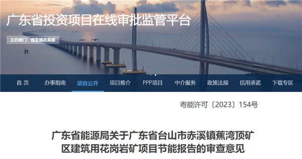 8月30日,廣東省發(fā)展和改革委員會發(fā)布關(guān)于中電建江門臺山赤溪鎮(zhèn)蕉灣頂?shù)V區(qū)建筑用花崗巖礦項目節(jié)能報告的審查意見。該項目投資60億元,設(shè)計年開采花崗巖800萬方,年產(chǎn)碎石1384萬噸、機制砂590萬噸。