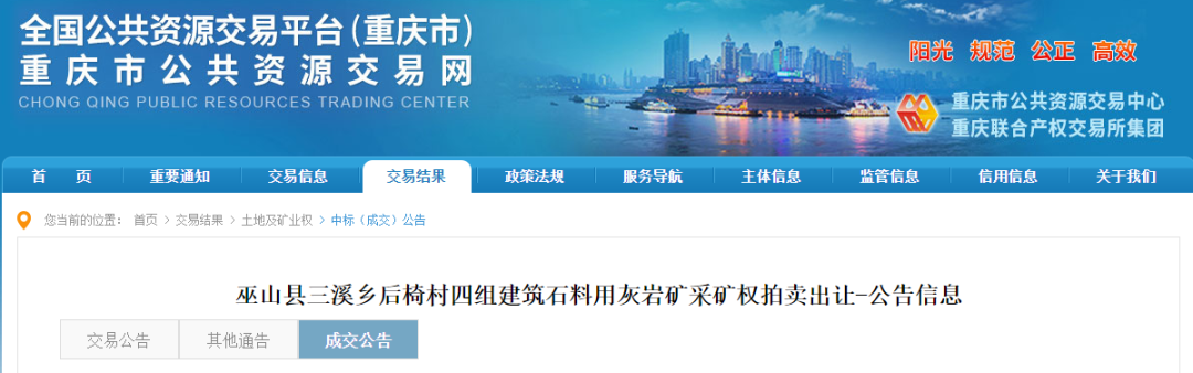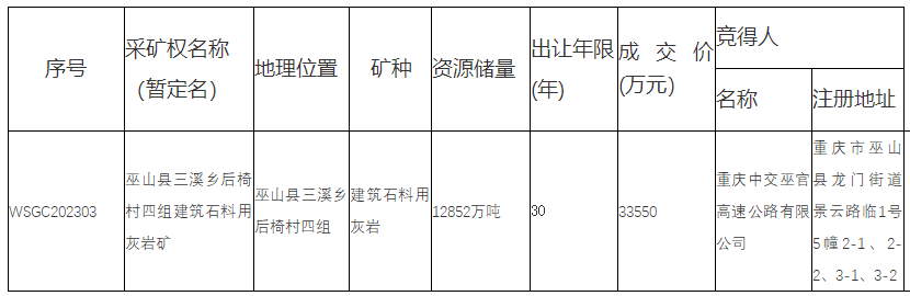巫山縣三溪鄉(xiāng)后椅村四組建筑石料用灰?guī)r礦采礦權(quán)出讓成交結(jié)果公示根據(jù) 《礦業(yè)權(quán)交易規(guī)則》、《探礦權(quán)采礦權(quán)招標(biāo)拍賣掛牌出讓管理暫行辦法(試行)》等有關(guān)規(guī)定,2023年8月11日在巫山縣公共資源交易中心成功拍賣出讓1宗采礦權(quán),現(xiàn)將交易結(jié)果公示如下:
