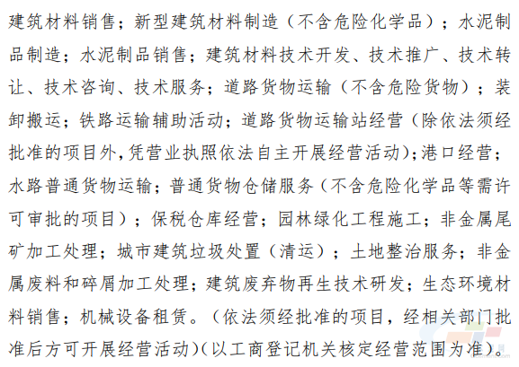 礦山)開采;建筑用石加工;建筑材料銷售;新型建筑材料制造(不含危險(xiǎn)化學(xué)品);水泥制品制造等。