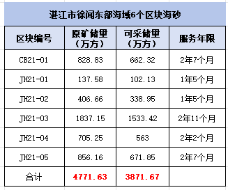 8月30日,據(jù)廣東湛江生態(tài)環(huán)境局消息,廣東省生態(tài)環(huán)境廳擬對廣東省湛江市徐聞東部海域6個(gè)區(qū)塊海砂開采環(huán)境影響報(bào)告書進(jìn)行審查。根據(jù)環(huán)評(píng)公示,6海砂原礦體積合計(jì)超4760萬方、可采資源儲(chǔ)量超3870萬方,服務(wù)年產(chǎn)1年5個(gè)月-2年11個(gè)月不等。(具體點(diǎn)擊:《廣東海砂持續(xù)釋放 湛江6區(qū)塊合計(jì)4770萬方回填用海砂環(huán)評(píng)受理》)