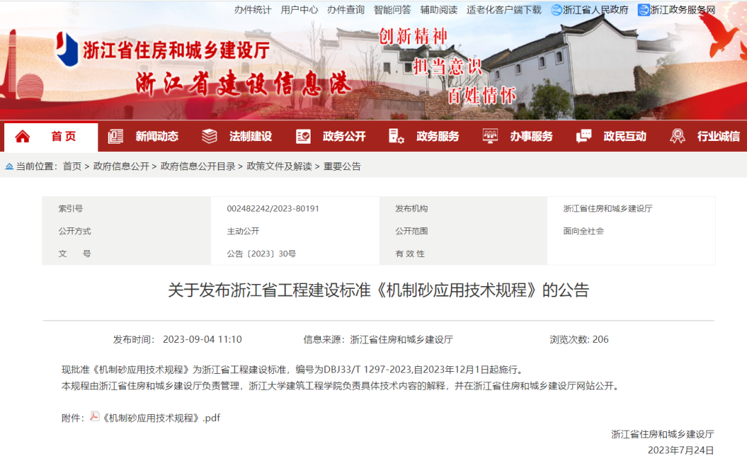 近日,浙江省住房和城鄉(xiāng)建設(shè)廳發(fā)布工程建設(shè)標(biāo)準(zhǔn)《機(jī)制砂應(yīng)用技術(shù)規(guī)程》(以下簡(jiǎn)稱《技術(shù)規(guī)程》),本規(guī)程共分為5章2個(gè)附錄。主要內(nèi)容包括:總則,術(shù)語(yǔ)和符號(hào),機(jī)制砂質(zhì)量要求,機(jī)制砂混凝土,機(jī)制砂砂漿。主編單位為浙江大學(xué)建筑工程學(xué)院、浙江交通資源投資集團(tuán)有限公司和海建設(shè)科技集團(tuán)有限公司。