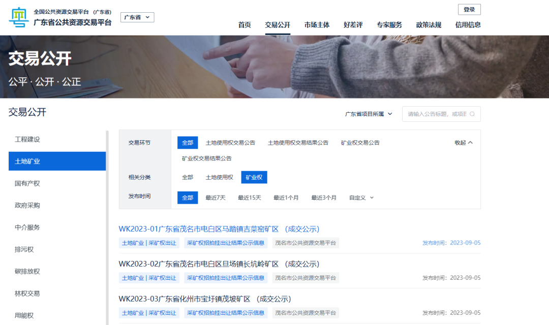 茂名市電白區(qū)馬踏鎮(zhèn)吉菜窯礦區(qū):競得人為茂名市茂盛彩耀礦業(yè)有限公司,最終成交價為13006.62萬元;茂名市電白區(qū)旦場鎮(zhèn)長坑嶺礦區(qū):競得人為茂名市茂盛長鏗礦業(yè)有限公司,最終成交價為9755.96萬元;化州市寶圩鎮(zhèn)茂坡礦區(qū):競得人為茂名市茂盛寶鼎礦業(yè)有限公司,最終成交價為4345.87萬元。
