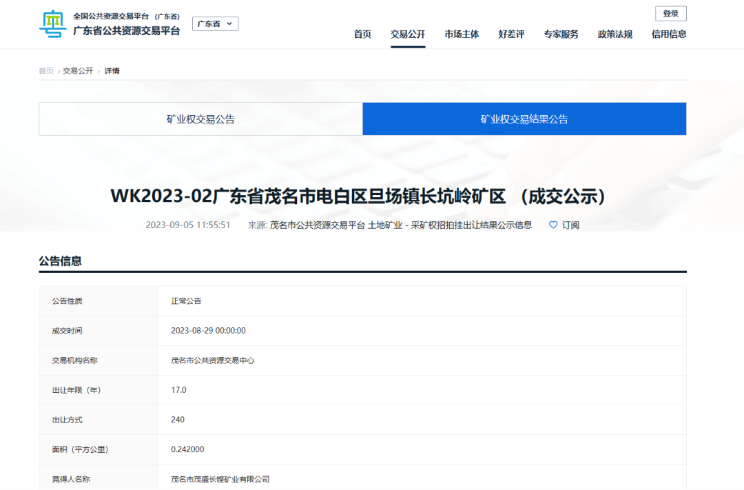 競得人:茂名市茂盛長鏗礦業(yè)有限公司