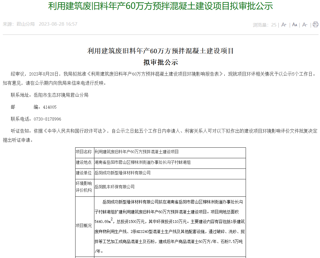 9月5日,岳陽(yáng)市生態(tài)環(huán)境局君山分局發(fā)布了關(guān)于《利用建筑廢舊料年產(chǎn)60萬(wàn)方預(yù)拌混凝土建設(shè)