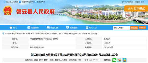 2023年9月7日,浙江省金華市磐安縣自然資源和規(guī)劃局發(fā)布公告,掛牌出讓一建筑用玄武巖礦采礦權(quán),擬出讓年限自采礦許可證頒發(fā)之日起8年,起始價6億元。另外,競得人還需額外支付政策處置費13639.34萬元。
