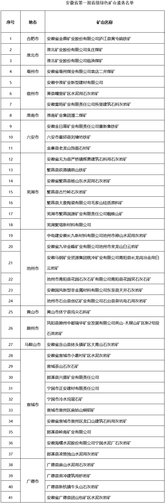 9月11日,安徽省自然資源廳發(fā)布第一批省級綠色礦山遴選名單。經材料審核、實地抽查、聯(lián)合審查,有41家礦山通過復核,擬納入第一批省級綠色礦山名錄,其中建材企業(yè)有20家。