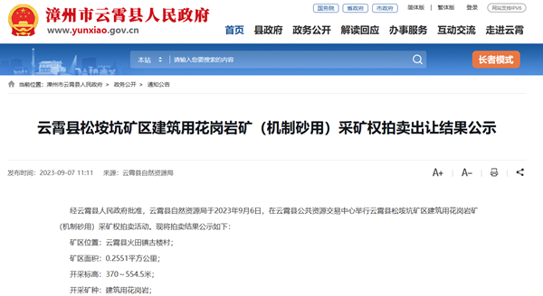 福建云霄縣松垵坑礦區(qū)建筑用花崗巖礦(機(jī)制砂用)采礦權(quán)成功出讓。該礦資源儲(chǔ)量522.74萬(wàn)方,出讓年限10年,起始價(jià)4000萬(wàn)元,成交價(jià)12150萬(wàn)元(約1.22億元),競(jìng)得單位為泉州鑫茂礦業(yè)有限公司。據(jù)砂石骨料網(wǎng)了解,該礦是福建省2023年首宗成功出讓的機(jī)制砂專用礦。