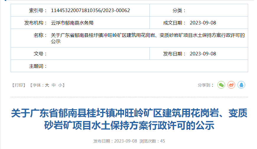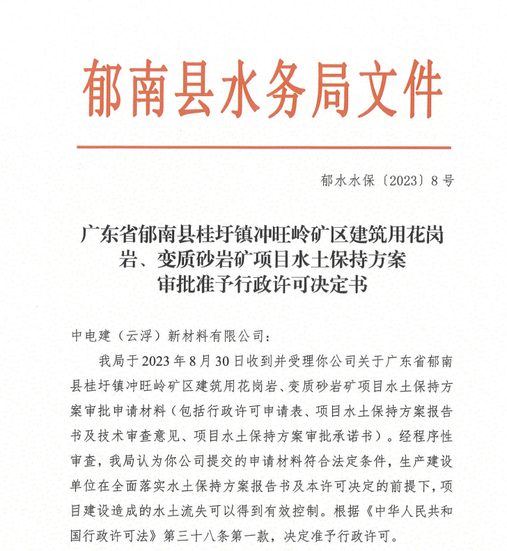 近日,廣東省郁南縣水務(wù)局對(duì)廣東省郁南縣桂圩鎮(zhèn)沖旺嶺礦區(qū)建筑用花崗巖、變質(zhì)砂巖礦項(xiàng)目水土保持方案作出準(zhǔn)予行政許可決定。