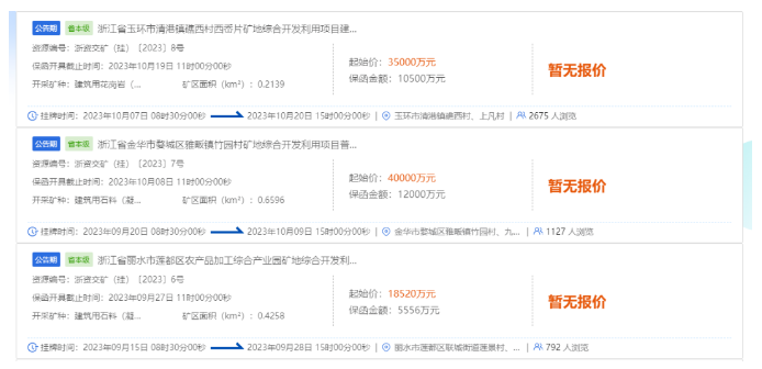 據(jù)悉,浙江2023年成功出讓12宗采礦權(quán)。同時,浙江省當(dāng)前新成交礦山大多為“項(xiàng)目類采礦權(quán)”,主要包含礦地綜合開發(fā)利用項(xiàng)目、廢棄礦區(qū)生態(tài)修復(fù)項(xiàng)目等,出讓年限相對較短但開采規(guī)模較大,起拍金額也較高。