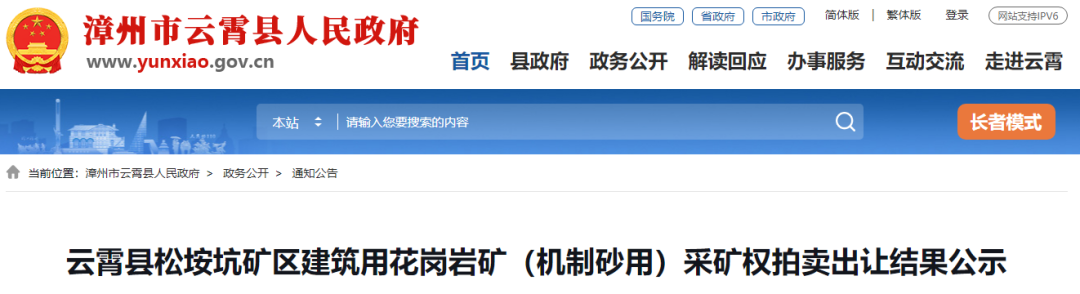 云霄縣松垵坑礦區(qū)建筑用花崗巖礦(機(jī)制砂用)采礦權(quán)拍賣出讓結(jié)果公示經(jīng)云霄縣人民政府批準(zhǔn),云霄縣自然資源局于2023年9月6日,在云霄縣公共資源交易中心舉行云霄縣松垵坑礦區(qū)建筑用花崗巖礦(機(jī)制砂用)采礦權(quán)拍賣活動(dòng)。現(xiàn)將拍賣結(jié)果公示如下: