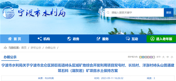 9月11日,浙江省寧波市水利局發(fā)布寧波市北侖區(qū)郭巨街道峙頭區(qū)域礦地綜合開發(fā)利用項目雙屯村、長坑村、洋漲村峙頭山普通建筑石料(凝灰?guī)r)礦項目水土保持方案報告書擬審批公示。該項目總投資26億元,年生產(chǎn)規(guī)模1020萬噸,計劃2023年10月開工,2027年9月完工,總工期48個月。建設(shè)單位寧波浙青礦業(yè)有限公司,為國有企業(yè)。
