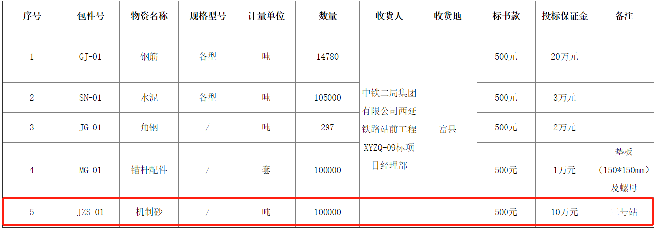 近日,中鐵二局集團有限公司發(fā)布西延鐵路站前工程XYZQ-9標 鋼筋、水泥、角鋼、錨桿配件、砂石料招標公告,其中機制砂招標數量為10萬噸,水泥為10.5萬噸。