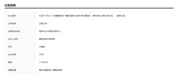 廣東省梅州市蕉嶺縣廣福鎮(zhèn)石峰礦區(qū)粉料用大理巖礦、熔劑用白云巖礦采礦權(quán)掛牌出讓。該礦資源儲(chǔ)量9280.84萬方(約25058萬噸),年產(chǎn)能360萬方(約972萬噸),出讓年限30年,起拍價(jià)150000萬元(15億元)。出讓公告中并沒有明確該采礦權(quán)收益繳納方式是分期繳納還是一次性繳納。