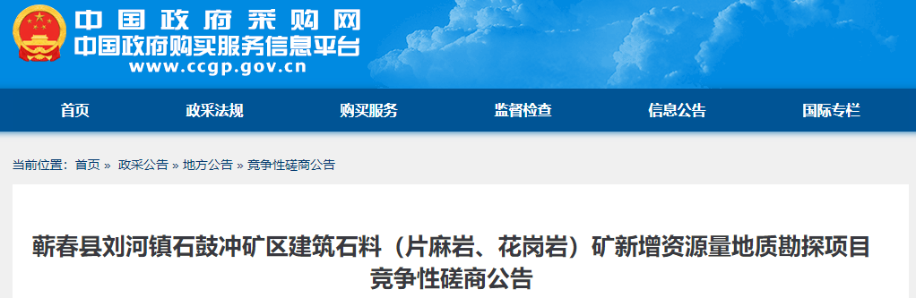 蘄春縣劉河鎮(zhèn)石鼓沖礦區(qū)建筑石料(片麻巖、花崗巖)礦新增資源量地質(zhì)勘探項(xiàng)目競爭性磋商公告