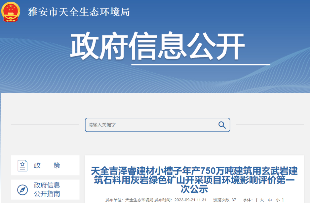 9月21日,四川雅安市天全生態(tài)環(huán)境局發(fā)布天全吉澤睿建材小槽子年產(chǎn)750萬(wàn)噸建筑用玄武巖建筑石料用灰?guī)r綠色礦山開(kāi)采項(xiàng)目環(huán)境影響評(píng)價(jià)第一次公示。