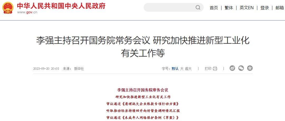 新華社北京9月20日電?國(guó)務(wù)院總理李強(qiáng)9月20日主持召開(kāi)國(guó)務(wù)院常務(wù)會(huì)議,研究加快推進(jìn)新型工業(yè)化有關(guān)工作,審議通過(guò)《清理拖欠企業(yè)賬款專(zhuān)項(xiàng)行動(dòng)方案》,聽(tīng)取推動(dòng)經(jīng)濟(jì)持續(xù)回升向好督查調(diào)研情況匯報(bào),審議通過(guò)《未成年人網(wǎng)絡(luò)保護(hù)條例(草案)》。