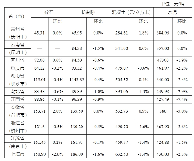 長江經(jīng)濟帶部分省(市)機制砂價格環(huán)比增速