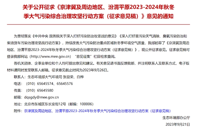 9月22日,生態(tài)環(huán)境部發(fā)布了關于公開征求《京津冀及周邊地區(qū)、汾渭平原2023-2024年秋冬季大氣污染綜合治理攻堅行動方案(征求意見稿)》意見的通知。征求意見截止時間為2023年9月26日。