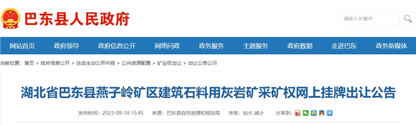 近日,湖北省恩施巴東縣自然資源和規(guī)劃局發(fā)布巴東縣燕子嶺礦區(qū)建筑石料用灰?guī)r礦采礦權(quán)掛牌出讓公告。該礦保有資源儲量4125.11萬方(合11096.5萬噸),生產(chǎn)規(guī)模900萬噸/年,出讓年限14年(采礦期12年、基建期2年),起始價1.3億元,噸成本約1.17元。掛牌時間2023年10月20日-2023年11月2日。
