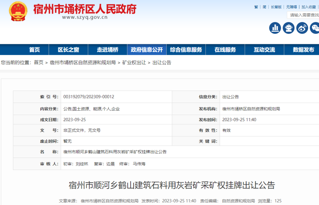 宿州市順河鄉(xiāng)鶴山建筑石料用灰?guī)r礦采礦權(quán)掛牌出讓公告