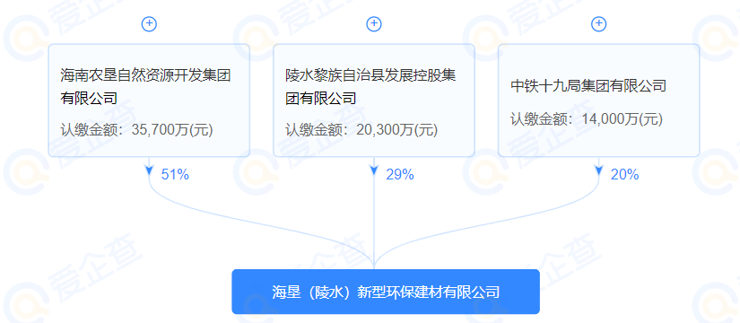 據(jù)愛(ài)企查查詢可知,海墾(陵水)新型環(huán)保建材有限公司成立于2023年08月23日,注冊(cè)地位于海南省陵水黎族自治縣黎安鎮(zhèn)海風(fēng)小鎮(zhèn)綜合服務(wù)中心三樓,法定代表人為孔仲。由海南農(nóng)墾自然資源開發(fā)集團(tuán)有限公司(占比51%)、陵水黎族自治縣發(fā)展控股集團(tuán)有限公司(占比29%)、中鐵十九局集團(tuán)有限公司(占比20%)共同組建,控股公司都是國(guó)企。
