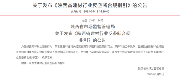 9月18日,據(jù)陜西省市場監(jiān)管局官網(wǎng)消息,為幫助建材行業(yè)相關(guān)經(jīng)營者更好識別和防范壟斷風(fēng)險,該局制定了《陜西省建材行業(yè)反壟斷合規(guī)指引》(以下簡稱《指引》)。