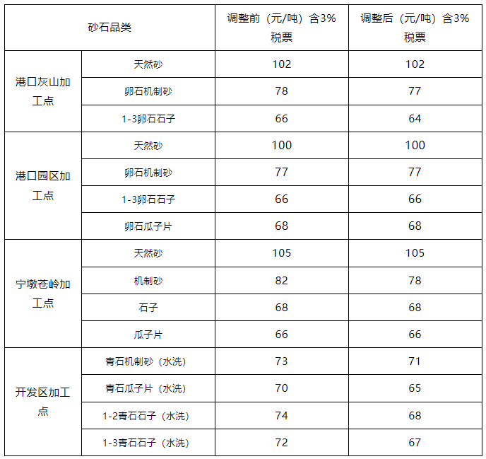 近日,寧國國控下屬子公司寧國城市建設(shè)投資有限公司寧墩分公司、寧國市中津建材貿(mào)易有限公司發(fā)布砂石價(jià)格最新調(diào)整通知。