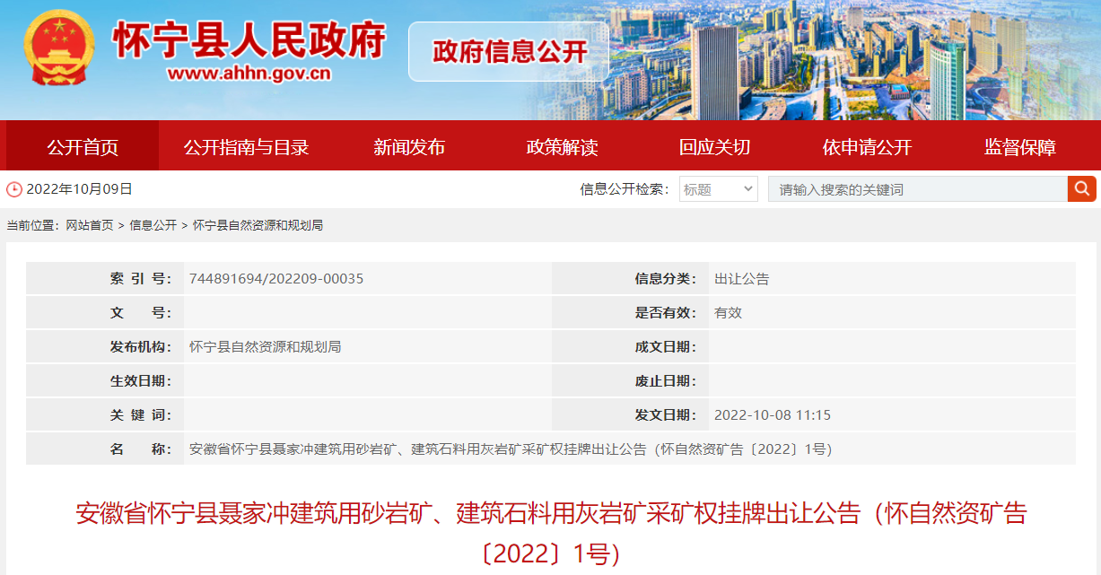 2022年10月,安徽省懷寧縣出讓此處建筑用砂巖礦、建筑石料用灰?guī)r礦采礦權(quán);