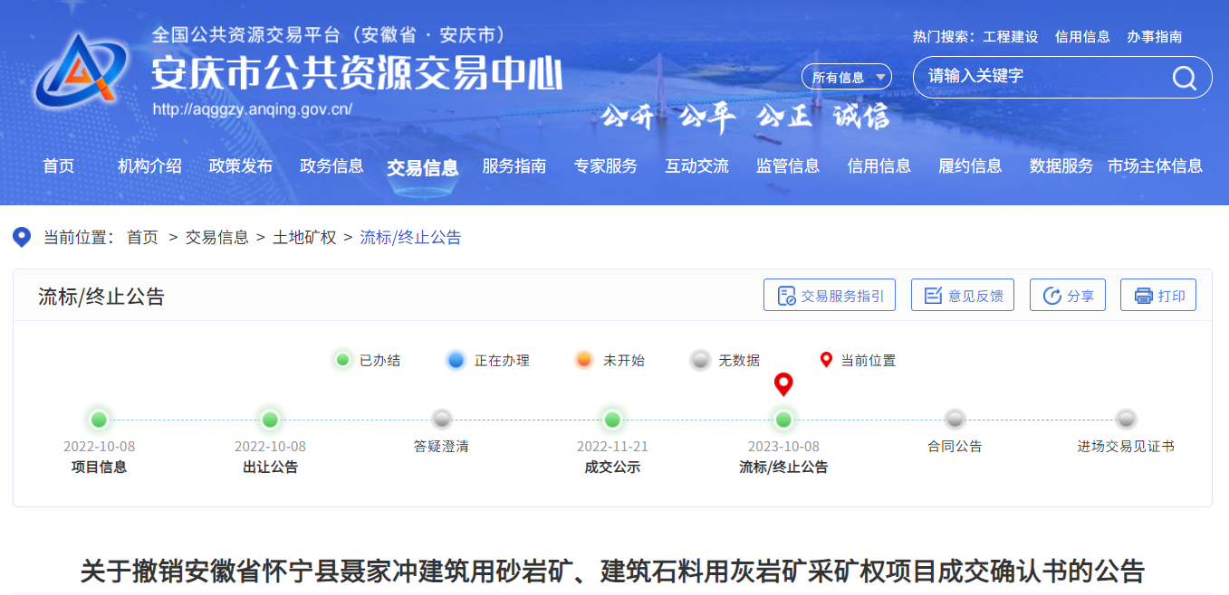 2023年10月8日,安徽安慶市公共資源交易平臺(tái)發(fā)布撤銷安徽省懷寧縣聶家沖建筑用砂巖礦、建筑石料用灰?guī)r礦采礦權(quán)項(xiàng)目成交確認(rèn)書的公告。