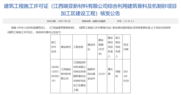 2023年5月,江西瑞亞新材料有限公司發(fā)布該項(xiàng)目綜合利用建筑骨料及機(jī)制砂項(xiàng)目加工區(qū)建設(shè)工程招標(biāo)公告。