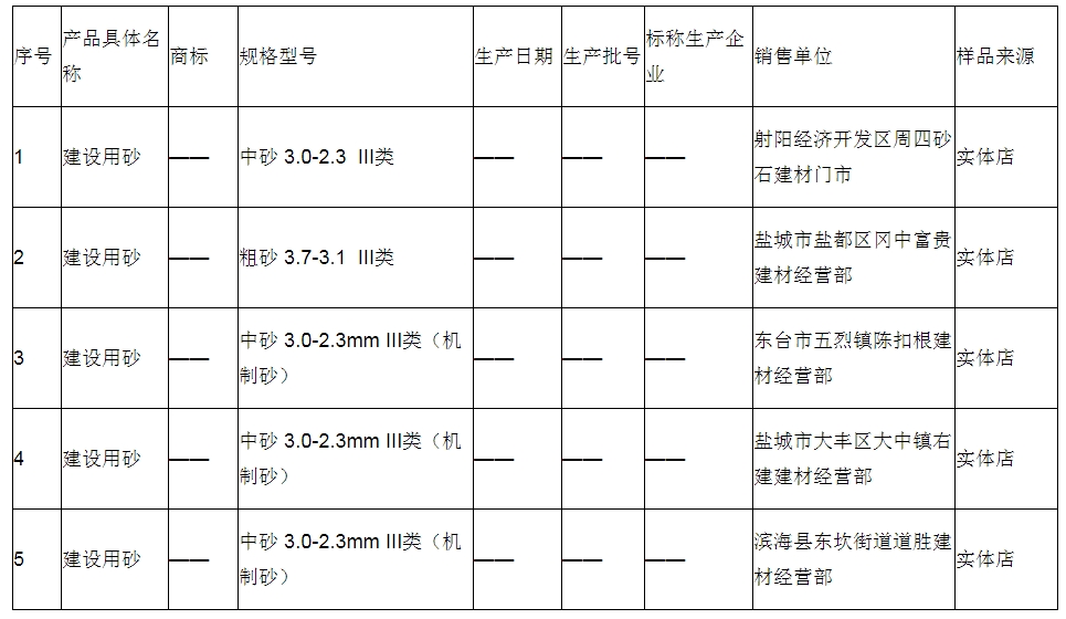 江蘇省鹽城市市場監(jiān)管局抽查建設(shè)用砂產(chǎn)品5批次均合格