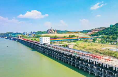 為保護環(huán)境并提高運輸效率,2021年,瑞昌市啟動各礦山通往長江碼頭的空中運輸廊道建設(shè),將礦石從地面車輛運輸變?yōu)榭罩欣鹊纻魉汀T撨\輸廊道總投資8.37億元,全長7.5公里,年運輸能力達4000萬噸。輸送帶將礦石通過這條運輸廊道運送到儲料罐,再通過輸送帶分發(fā)到貨輪,運往全國各地,全程實現(xiàn)無人化檢測、監(jiān)控和操作,有效提升了港口岸線資源利用率。在靠近長江碼頭邊的一段運輸廊道上,還安裝了長約300米的碲化鎘發(fā)電玻璃。彩色的碲化鎘發(fā)電玻璃像一道彩虹飛架在長江之濱,不僅成為江邊一景,而且每年可發(fā)電52萬千瓦時。一條廊道,雙重收益,打造出了高效、節(jié)能、綠色、環(huán)保的現(xiàn)代化港口。