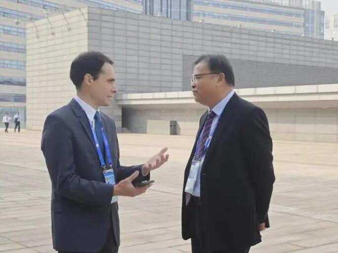 華新水泥股份有限公司總裁李葉青(右)與巴西InterCement集團(tuán)代表馬爾科交流。蔡雅思 攝