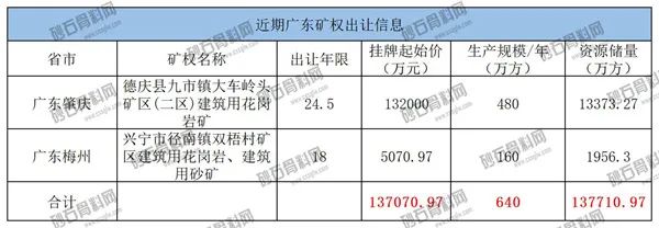2023年10月14日,廣東肇慶市公共資源交易平臺(tái)發(fā)布德慶縣九市鎮(zhèn)大車嶺頭礦區(qū)(二區(qū))建筑用花崗巖礦采礦權(quán)出讓公告。礦區(qū)范圍內(nèi)累計(jì)查明建筑用花崗巖礦資源量礦石量13373.27萬方,歷年開采動(dòng)用(消耗)探明資源量礦石量156.67萬方,保有資源量礦石量13216.6萬方,生產(chǎn)規(guī)模480萬方/年,出讓年限24.5年(含基建期2年、閉坑治理區(qū)1年),起始價(jià)13.2億元,掛牌時(shí)間為2023年11月11日至2023年11月24日。