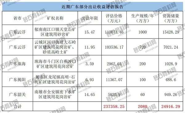 據(jù)不完全統(tǒng)計(jì),2023年10月9-19日,廣東地區(qū)又有5宗砂石礦發(fā)布出讓收益評(píng)估報(bào)告,合計(jì)評(píng)估收益約24億元,年生產(chǎn)規(guī)模2080萬方,資源儲(chǔ)量約2.5億方(下附具體礦權(quán)信息)。其中,年產(chǎn)最高的為廣東云浮郁南縣南江口鎮(zhèn)天堂山礦區(qū)建筑用砂巖礦,評(píng)估利用年生產(chǎn)規(guī)模1000萬方;年產(chǎn)最低的為廣東南雄市全安鎮(zhèn)密下水礦區(qū)建筑用花崗巖礦,評(píng)估利用年生產(chǎn)規(guī)模60萬方。