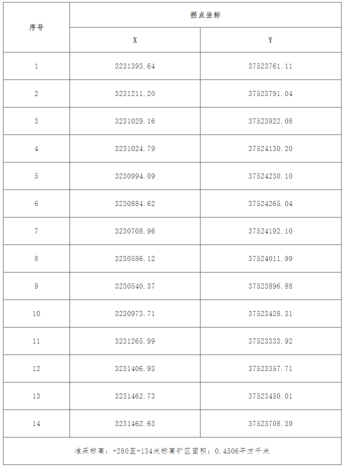 3.5采礦權(quán)范圍拐點(diǎn)坐標(biāo)、準(zhǔn)采標(biāo)高及面積(2000國(guó)家大地坐標(biāo)系,1985國(guó)家高程基準(zhǔn)):