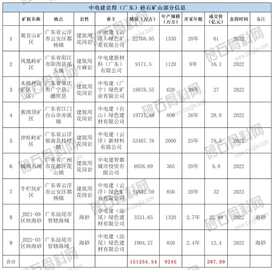 據(jù)了解,2022年,中電建開(kāi)始加速骨料業(yè)務(wù)布局,截止目前,僅廣東地區(qū),中電建就已獲得砂石礦9宗(含海砂),合計(jì)儲(chǔ)量超15億方,年產(chǎn)超9200萬(wàn)方,資源價(jià)款約288億元。
