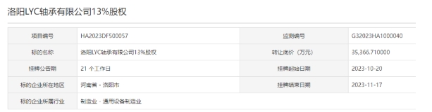 洛陽(yáng)LYC軸承13%股權(quán)掛牌轉(zhuǎn)讓,底價(jià)3.54億元!