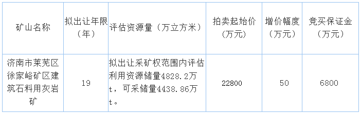 據(jù)環(huán)球破碎機(jī)網(wǎng)獲悉,濟(jì)南市萊蕪區(qū)自然資源局網(wǎng)上公開拍賣出讓兩宗建筑石料用灰?guī)r采礦權(quán),兩宗采礦權(quán)資源儲量共計(jì)約6620萬噸,起始價(jià)共計(jì)近3億元。