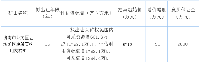 礦區(qū)位于濟(jì)南市萊蕪區(qū)高莊街道徐家峪村西北,擬出讓采礦權(quán)范圍內(nèi)可采資源量1789.7萬m³(4828.2萬t),評估利用資源儲量4828.2萬t,可采儲量4438.86萬t,生產(chǎn)能力260萬t/年,預(yù)計(jì)基建期2年,開采服務(wù)年限17年,起始價(jià)2.28億元。