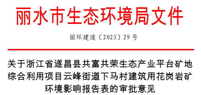 關(guān)于浙江省遂昌縣共富共榮生態(tài)產(chǎn)業(yè)平臺(tái)礦地綜合利用項(xiàng)目云峰街道下馬村建筑用花崗巖礦環(huán)境影響報(bào)告表的審批意見
