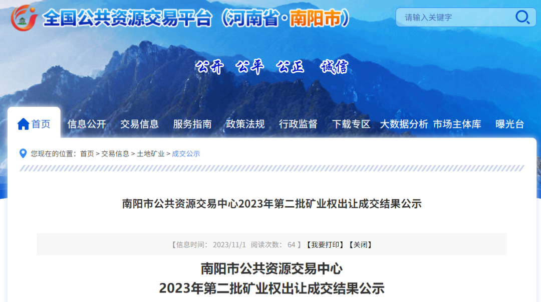 2023年3月,河南省新安縣發(fā)達建設投資集團有限公司以60000萬元競得新安縣北冶關址建筑石料用灰?guī)r礦采礦權。該礦資源儲量20195.76萬噸,年產800萬噸,出讓年限25.7年;2023年5月,河南衛(wèi)輝市新投礦產資源有限公司以164054.47萬元競得衛(wèi)輝市南寺白云巖礦采礦權。該礦資源儲量61257.5萬噸,年產950萬噸,出讓年限30年;2023年5月,河南方城縣宛北水泥(集團)有限責任公司以14100萬元競得方城縣清河鎮(zhèn)榆林坪村花石墻建筑用大理巖礦。該礦資源儲量4249.66萬噸,年產200萬噸,出讓年限21.6年,起拍價14100萬元。