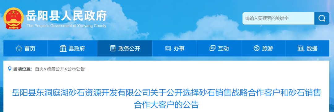 就在今日!湖南省岳陽市岳陽縣發(fā)布了《東洞庭湖砂石資源開發(fā)有限公司關(guān)于公開選擇砂石銷售戰(zhàn)略合作客戶和砂石銷售合作大客戶的公告》。根據(jù)公告內(nèi)容: